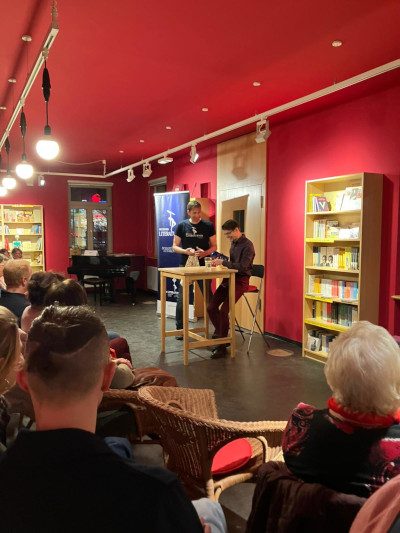 Den Anfang machte Uli, der mit Die letzte Rettung den dritten Platz erreichte. In seiner Kurzgeschichte einer von Krankheit und Heimlichtuerei gezeichneten Familie ist Verdrängung das Mittel der Wahl geworden, um schwelenden Konfrontationen aus dem Weg zu gehen. Die Zweitplatzierte, Veronika, entführte uns in ihrer ironisch-lockeren Geschichte Barbara unterm Teppich aus einer Kleingartensiedlung in die Ägäis und zurück. Humoristisch ging es auch mit dem einzigen Lyrikbeitrag der Lesung weiter: Till trug sein Gedicht Morgen vielleicht vor, das sich der Schwierigkeit widmet, einem Freund aus dem Weg zu gehen, der eigentlich keiner ist. Till wurde zum Sieger des Wettbewerbs erkoren.